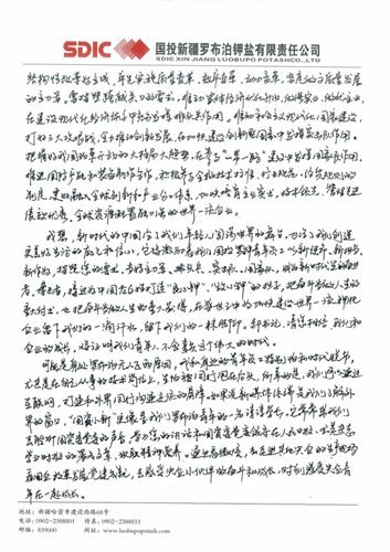 這封寫給郝鵬書記的信,來自國投新疆羅布泊鉀鹽有限責任公司硫酸鉀廠加工車間加工三班的一位普通青年員工。
