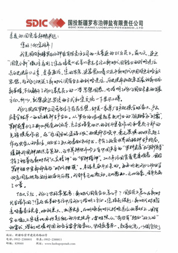 我是國投新疆羅布泊鉀鹽有限責任公司的一名普通的85后員工。前幾天,通過“國資小新”微信看到了您在接受《求是》雜志專訪的《新時代國有企業(yè)的戰(zhàn)略定位與歷史使命》文章,受益匪淺。您的思考,通篇貫徹著習近平新時代中國特色社會主義思想,為我們講述了新時代國有企業(yè)的戰(zhàn)略定位、歷史使命和改革發(fā)展的新目標新舉措,不僅解開了我們基層員工的一些思想困惑,也指明了我們國企未來的發(fā)展方向。所以,就想通過寫信的方式和您交流一下學習心得。