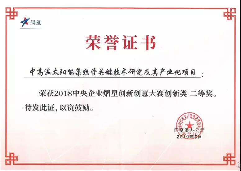 近日,由中國西電集團(tuán)推薦,寶光股份申報參賽的《中高溫太陽能集熱管的關(guān)鍵技術(shù)研究及其產(chǎn)業(yè)化》獲得2018年中央企業(yè)熠星創(chuàng)新創(chuàng)意大賽二等獎。