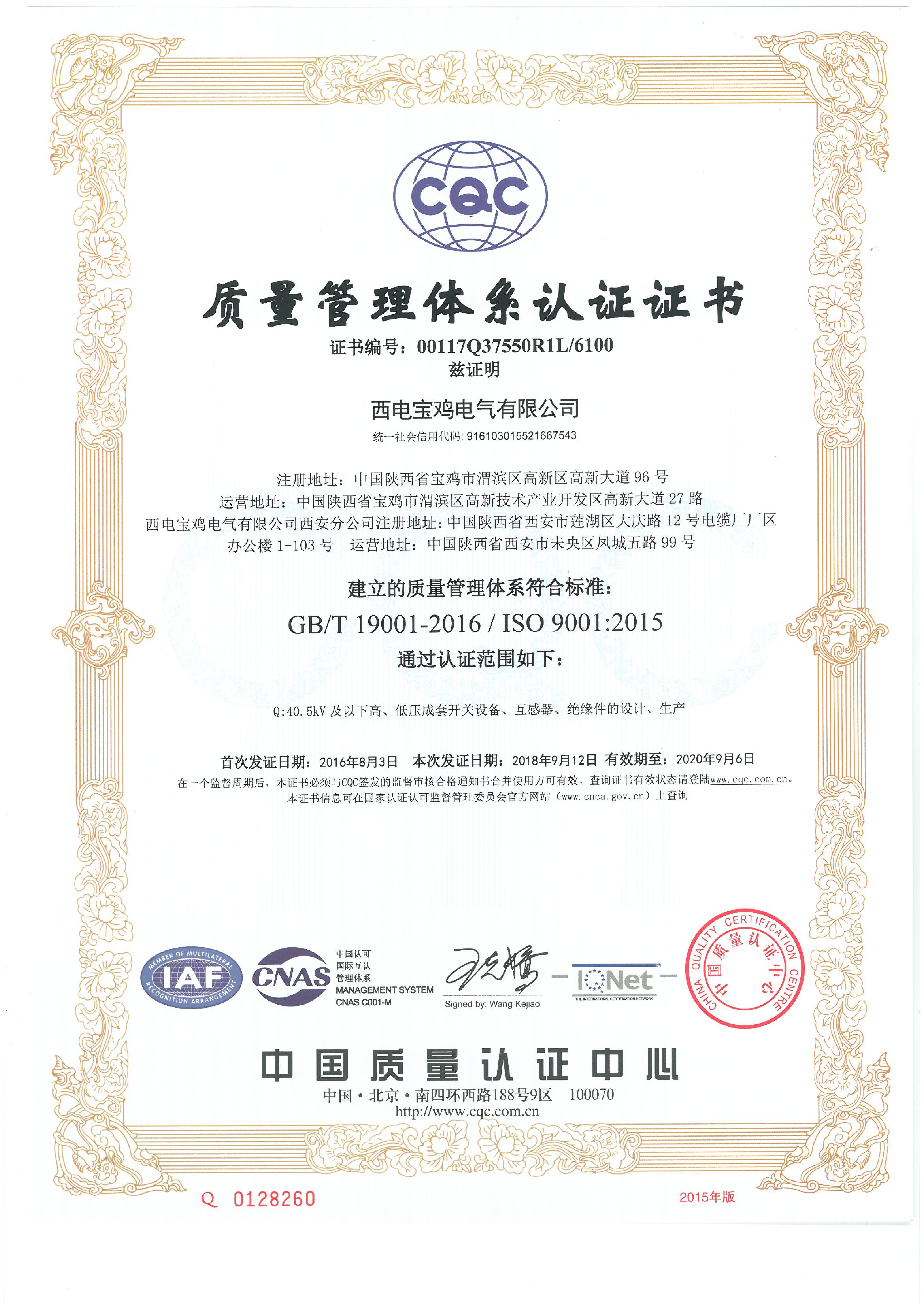 近日,從西電寶雞電氣傳來(lái)喜訊,公司已取得了新版(國(guó)標(biāo)2016版)認(rèn)證證書(shū),順利的完成了質(zhì)量、環(huán)境管理體系換版工作。 公司也將以此次轉(zhuǎn)版換證為契機(jī),嚴(yán)格執(zhí)行三體系標(biāo)準(zhǔn)要求,確保三體系的有效剛性運(yùn)行,不斷提升公司質(zhì)量、環(huán)境、職業(yè)健康安全管理水平,促進(jìn)企業(yè)高質(zhì)量發(fā)展。