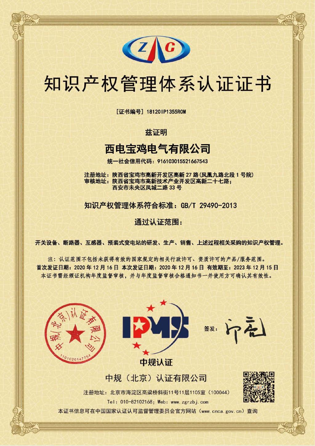 12月11日—12日,來自中知(北京)認證有限公司的3位評審專家,對西電寶雞電氣《企業(yè)知識產權管理規(guī)范》(GB/T29490-2013)進行了貫標審核。2020年12月16日,西電寶雞電氣正式取得知識產權管理體系認證證書。