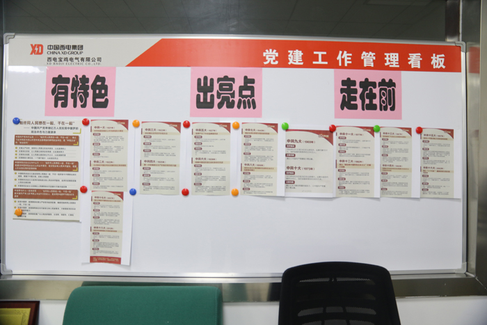 經(jīng)過西電寶雞電氣辦公樓三層西頭,大家不經(jīng)意間會發(fā)現(xiàn)兩個展板上展示著幾句鏗鏘有力的宣傳標(biāo)語“黨建增進(jìn)實(shí)力、黨建彰顯魅力、黨建激發(fā)活動”“聚精會神抓黨建、專心致志搞經(jīng)營、一心一意謀發(fā)展”,這只是看板背面,走進(jìn)西電寶雞電氣黨群工作處,兩塊黨建工作管理看板正面一下子映入人的眼簾,吸引人的眼球,“有特色、出亮點(diǎn)、走在前”九字工作方針更是格外醒目,公司黨委組織架構(gòu)、黨員構(gòu)成、年度工作目標(biāo)、年度重點(diǎn)工作,月度重點(diǎn)工作,本周主要工作、黨建督查情況反饋、宣傳簡報(bào)、喜迎十九大等欄目排列有序、圖文并茂、內(nèi)容詳盡。